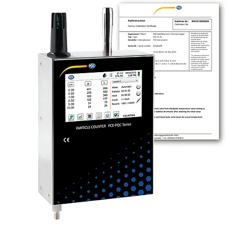O contador de partículas série PCE-PQC 32EU é o contador de partículas mais desenvolvido do mercado. É possível integrá-lo de forma simples na automação de edifícios ou salas brancas através de Ethernet, ou opcionalmente Wireless 802.11 b / g, RS-485 ou RS-232. O contador de partículas mede 6 tamanhos de partículas diferentes que o usuário pode selecionar, assim como a temperatura e a umidade relativa (sensores opcionais). Este contador de partículas registra 45.000 valores com data e hora.